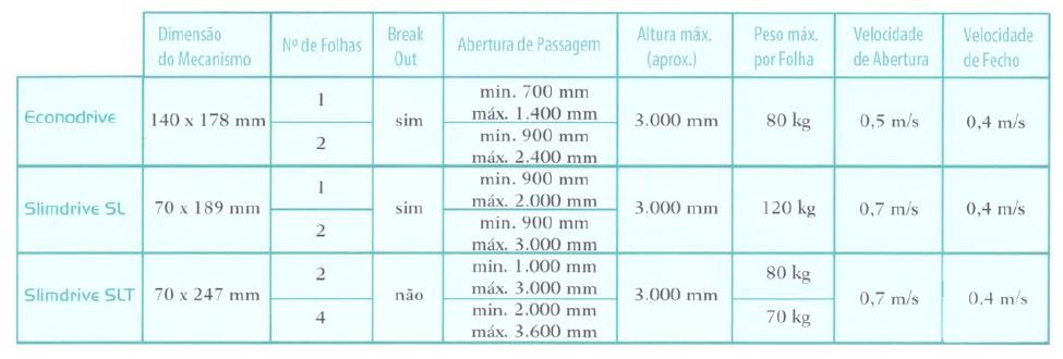 - Alto nível de segurança graças à limitação de forças no sentido de abertura e de fecho. Abertura de emergência durante cortes elétricos mediante o aumento de emergência.